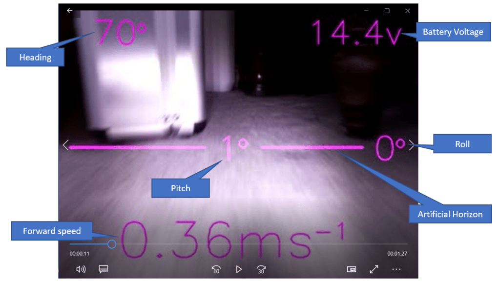 When we record the obstacle course, we plan to be running PiDrogen’s recording strategy. This records a video from the robot’s camera and marks it up with various information, a bit like a Head Up Display (HUD). See below.