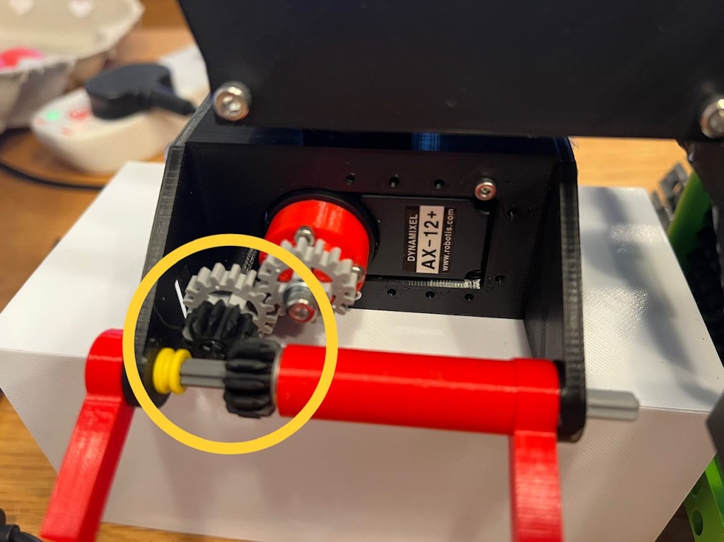 Unfortunately, it doesn’t work. The right-angle drive shown in the highlighted circle (which is made of Lego parts) is used to grip the top of the sheep. However, the shaft that carries the drive from the servo flexes when too much torque is applied. This results in the gears jumping and the mechanism loses synchronisation. The system is unable to apply enough grip to lift the sheep.