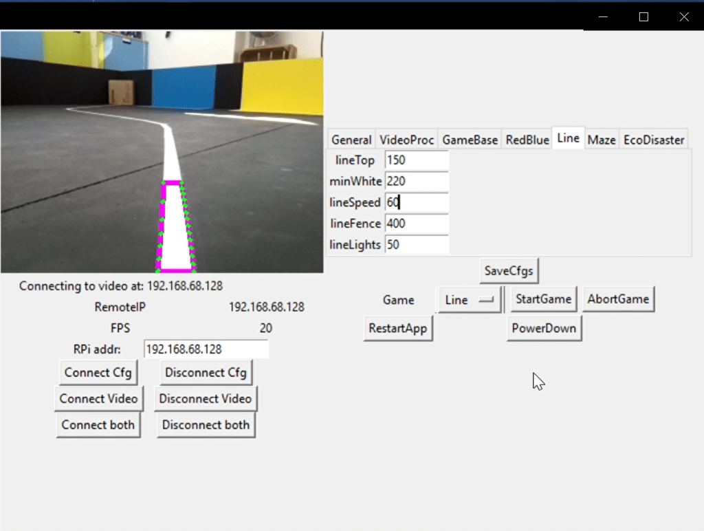 The software was essentially split in two. The code on the Pi in the robot presents an IP interface with two (latterly three) ports exposed. One port offers a control interface where parameters can be changed, the game can be selected and controlled, and some commands for the Pi can be issued. The second port provides a stream of marked-up video frames. A third port was added (on P21) to permit voice command of the robot.